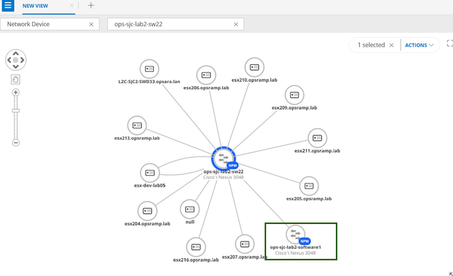 Select the device from the drop-down list.The topology explorer is displayed with the base resource you selected and its neighbours including the connections, based on the Depth level.