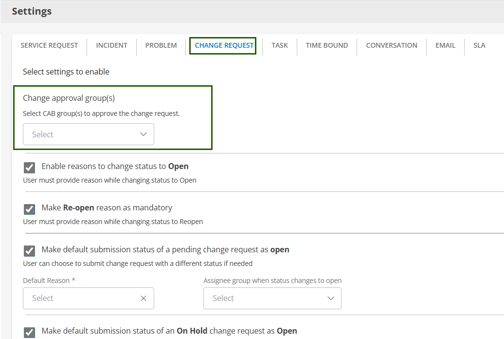 The Change Approval Group defines the users responsible for reviewing and approving change requests. You can assign these groups based on organizational requirements.