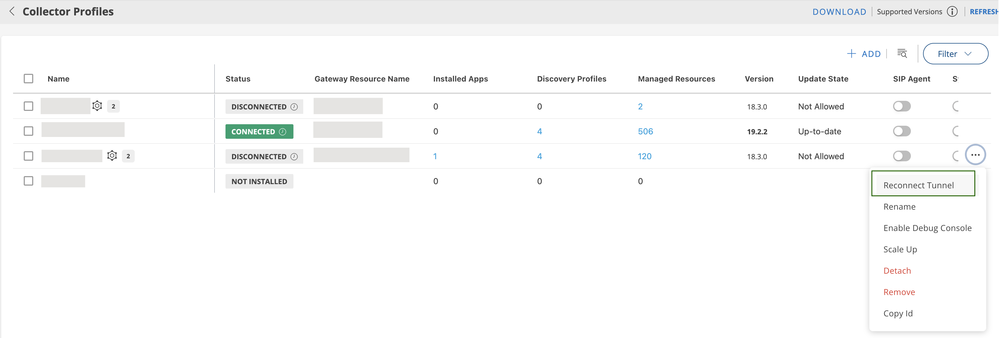 The Reconnect Tunnel option in the Collector Profiles screen will be deprecated as the platform now automatically manages all agent and gateway connections.